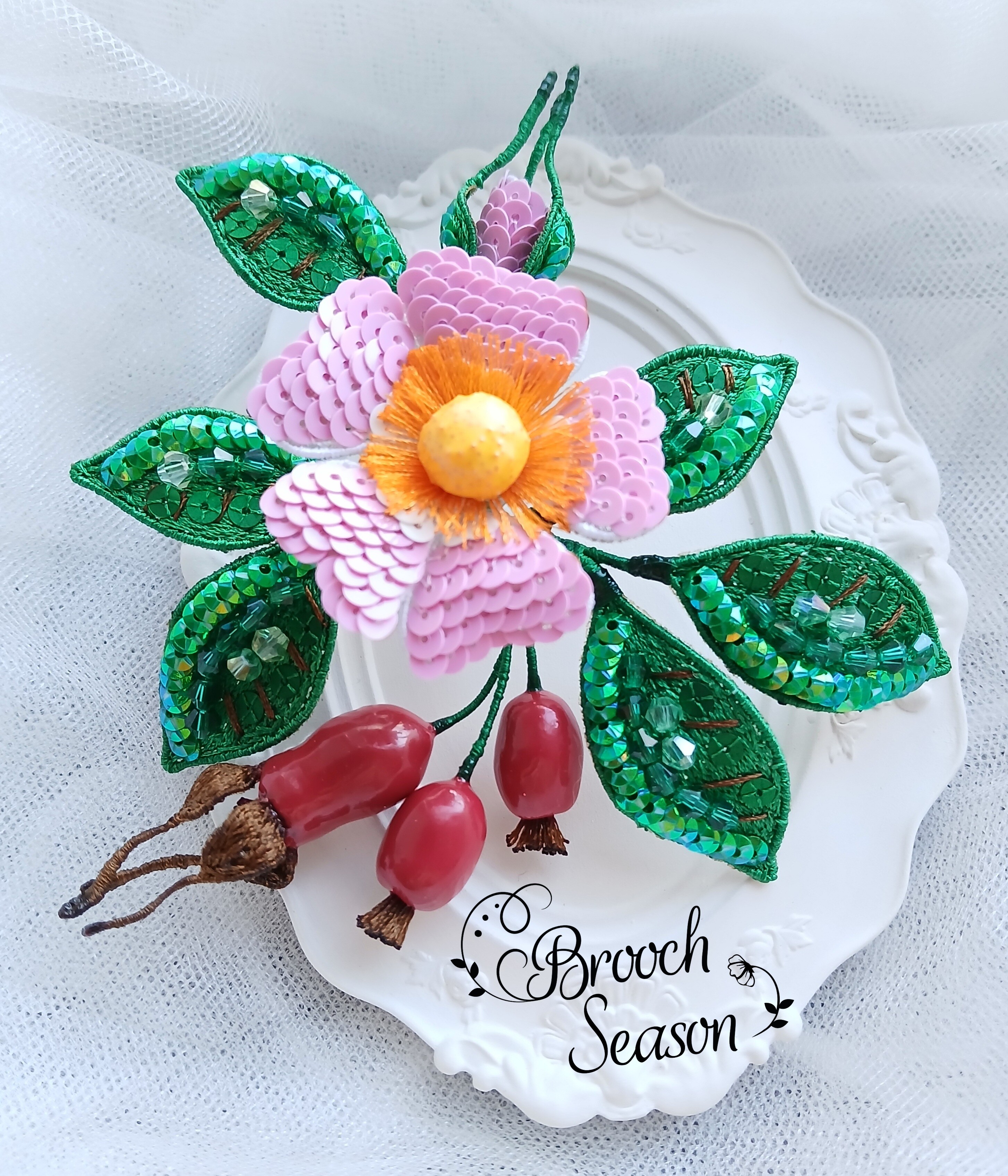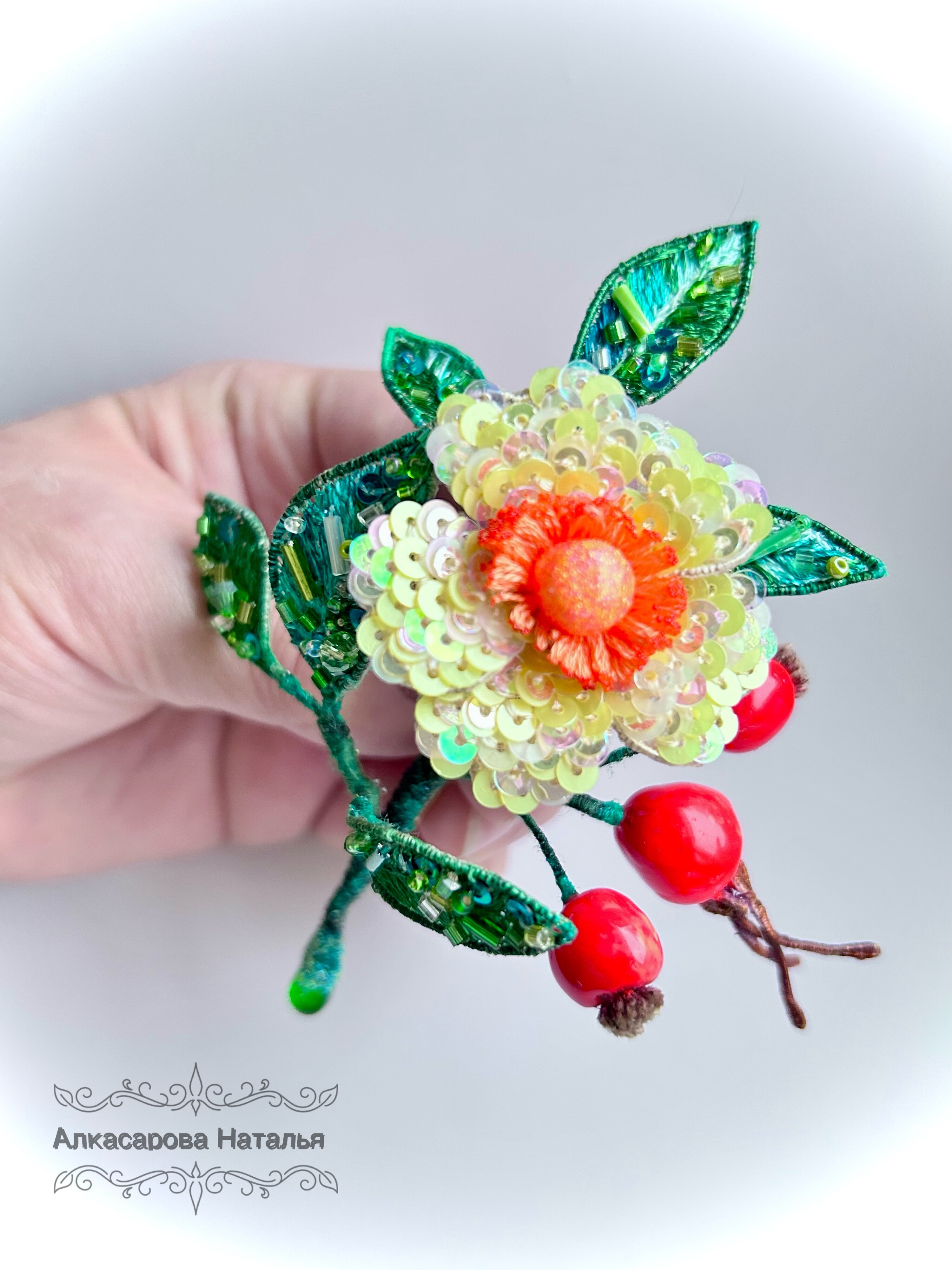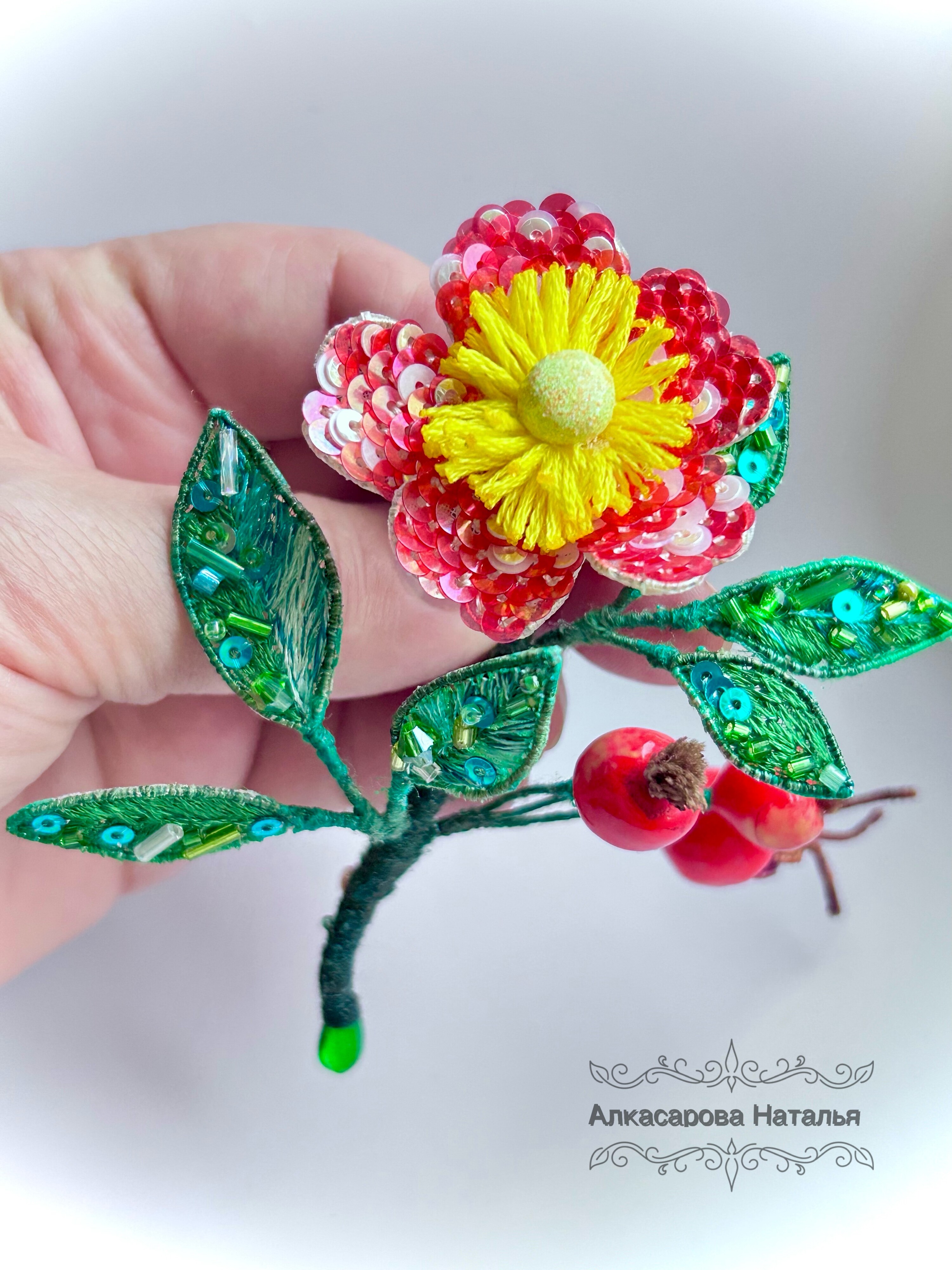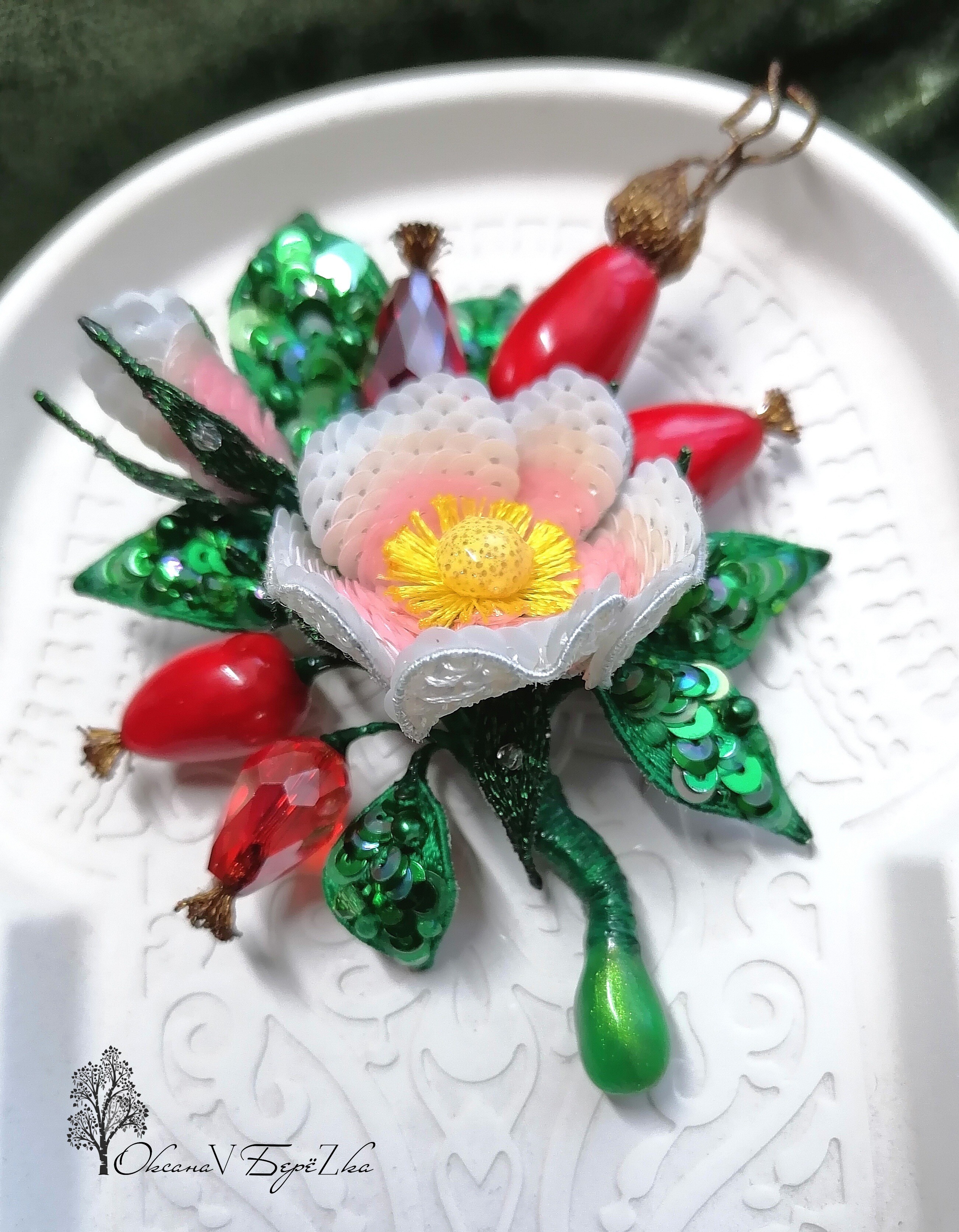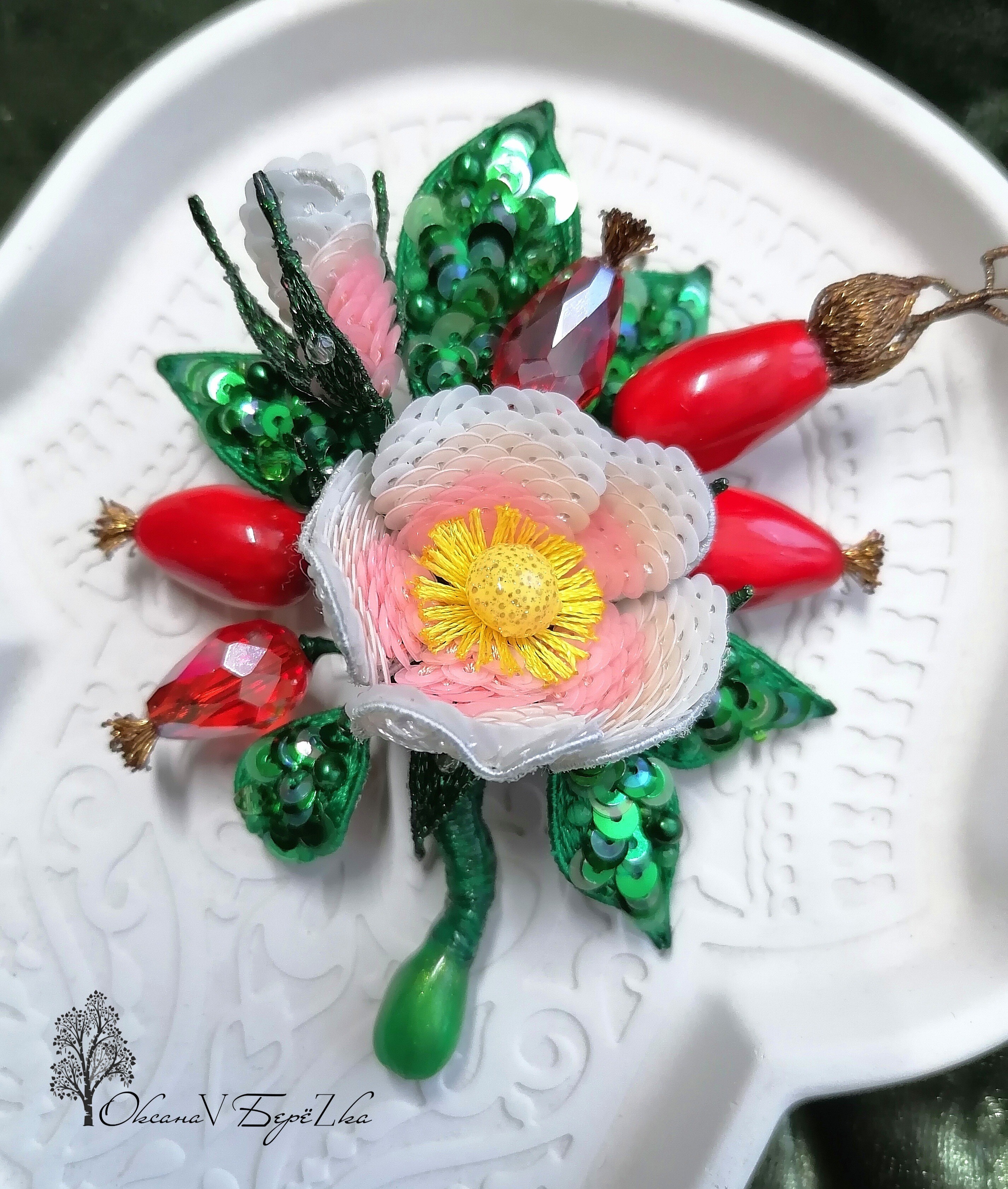 Ура! Брошь Дикий шиповник закончена! ❤ Очень гармоничная вышла веточка. Интересно было создавать ягоды, подбирать пайетки для красивого градиента цвета в цветке, смешивать краски, чтоб добиться нужного оттенка для ягод, замирать от восторга, когда получается желаемое, постепенно присоединять все детали к друг другу и радоваться преображению этого чуда! Благодарю за подробные и эстетичные уроки с приятным музыкальным сопровождением и за то, что полученные знания можно легко интегрировать в свои авторские задумки. Ваши уроки открывают безграничные творческие возможности �
