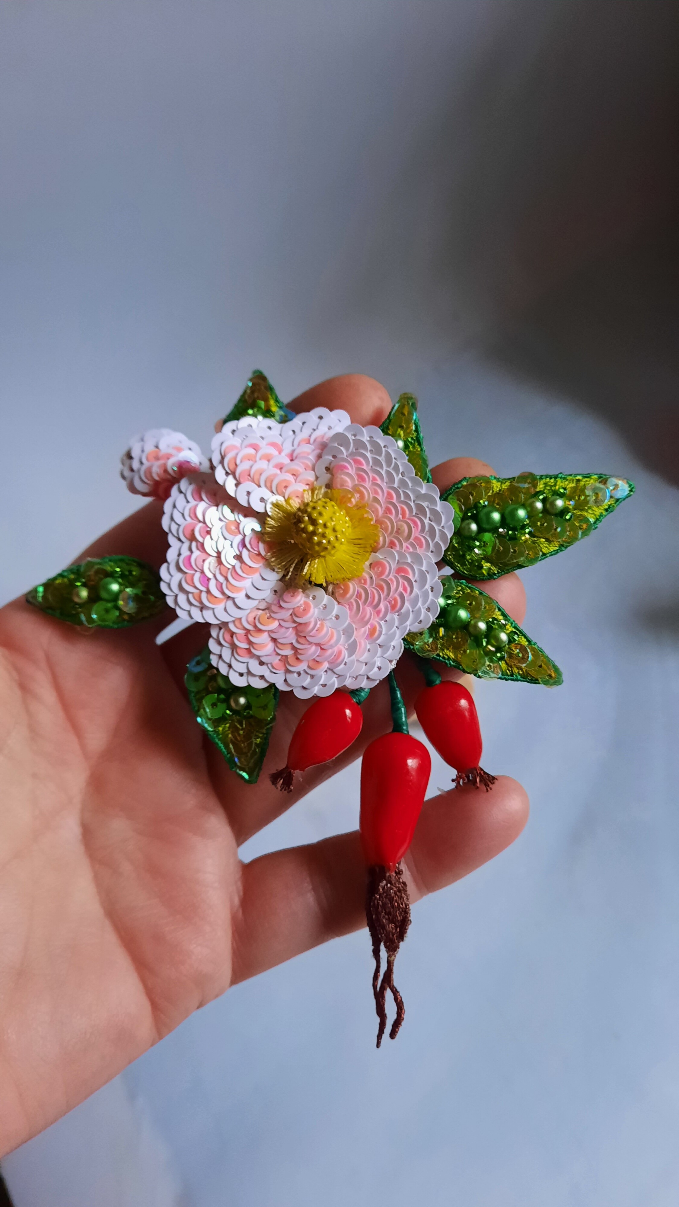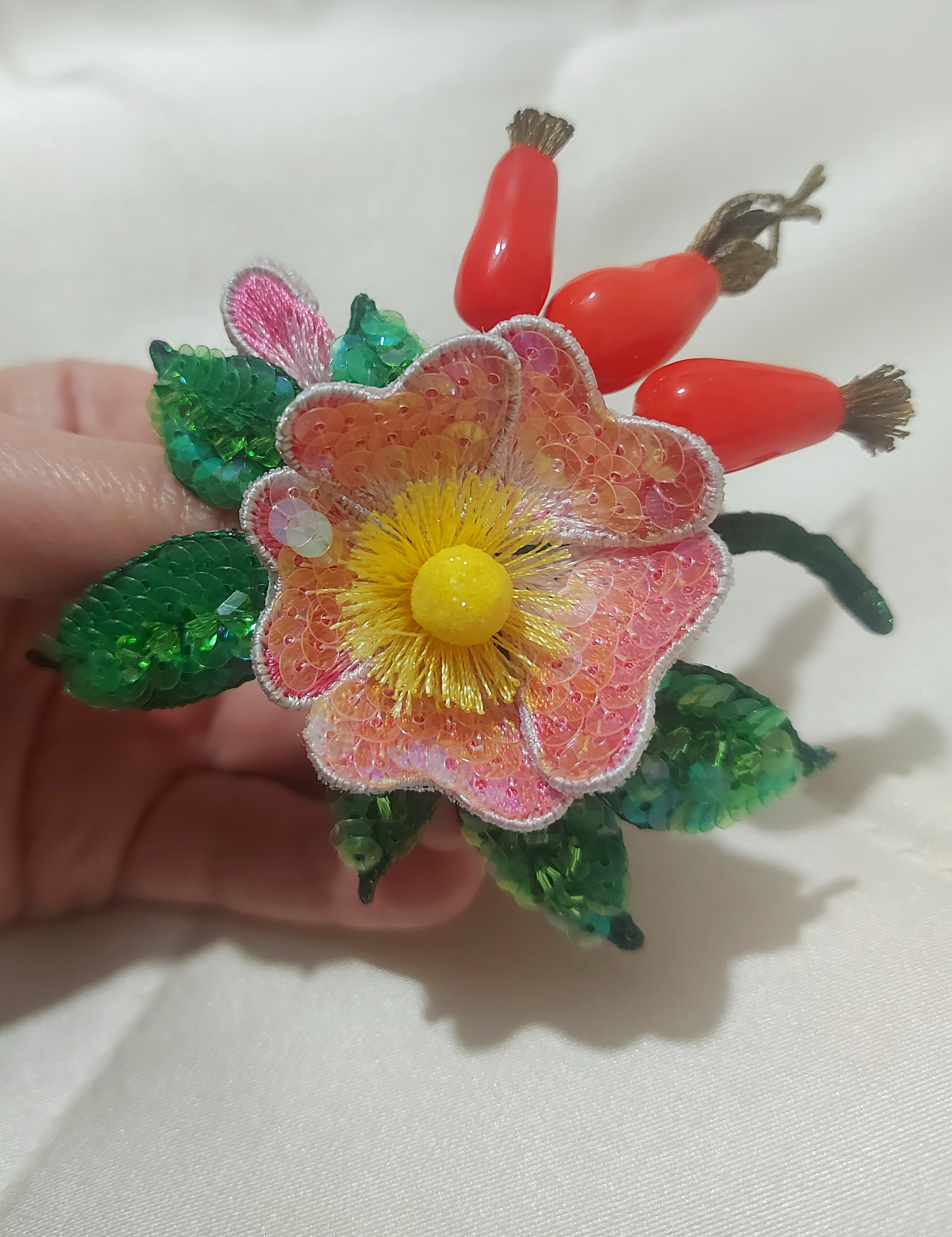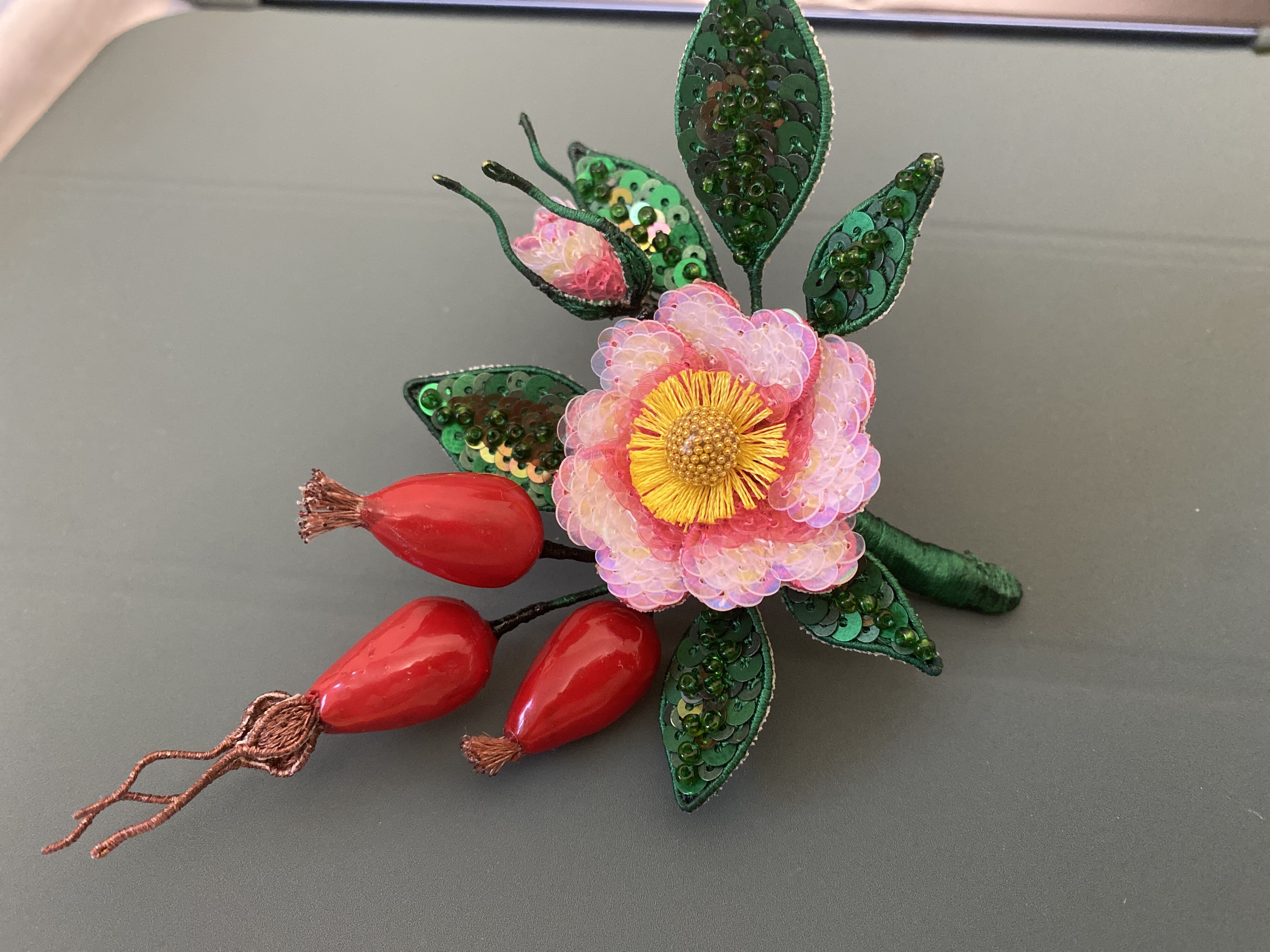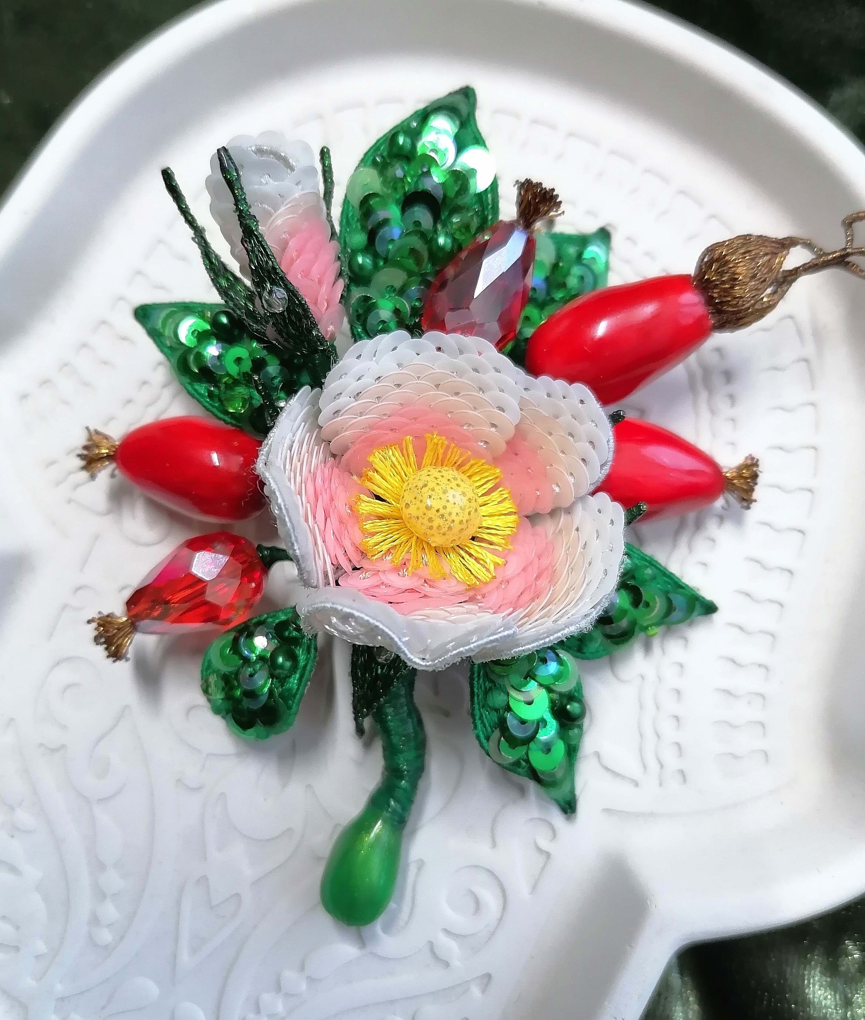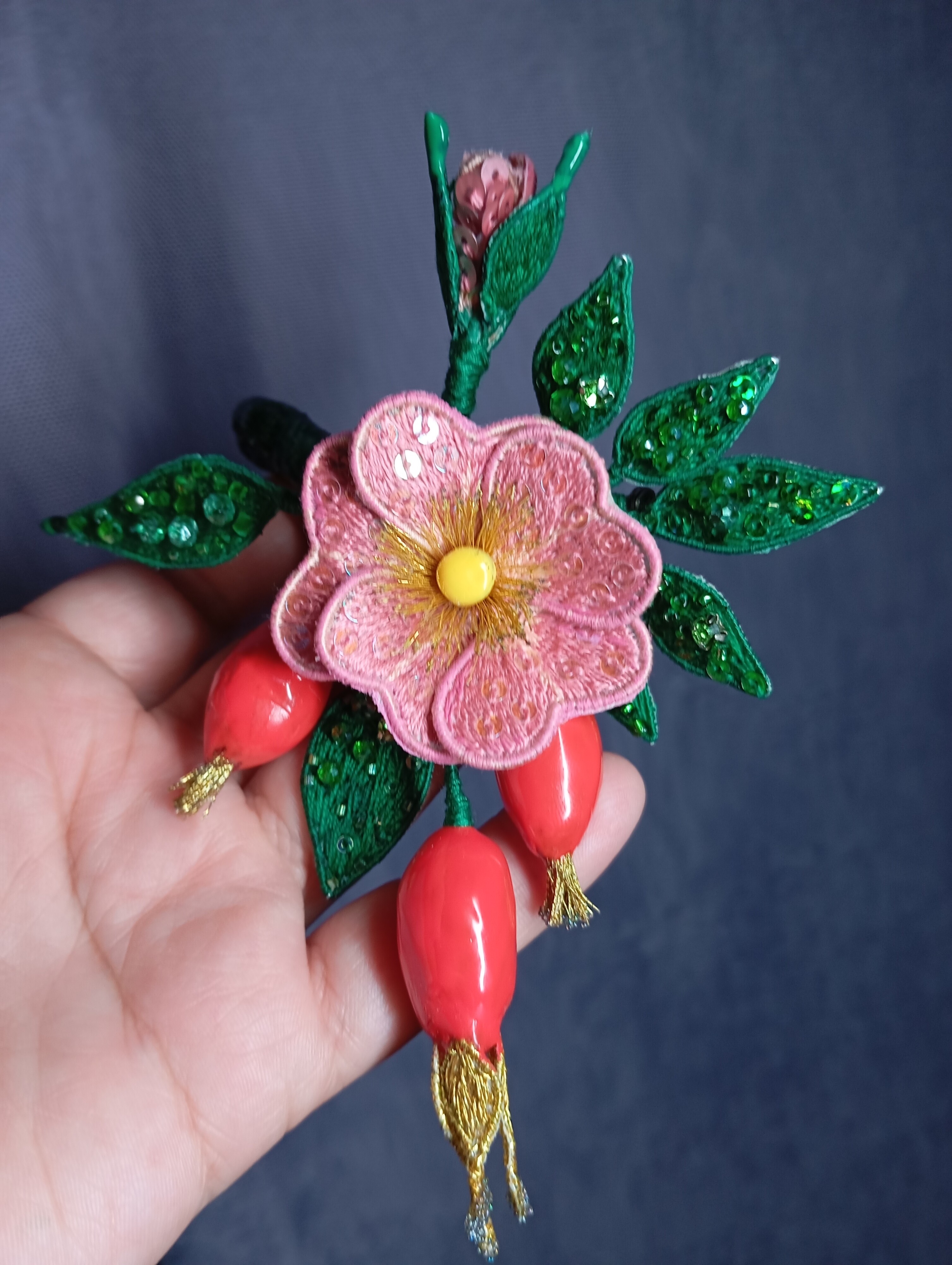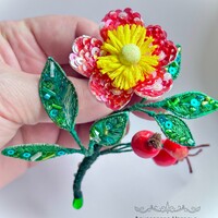 Ура! Брошь Дикий шиповник закончена! ❤ Очень гармоничная вышла веточка. Интересно было создавать ягоды, подбирать пайетки для красивого градиента цвета в цветке, смешивать краски, чтоб добиться нужного оттенка для ягод, замирать от восторга, когда получается желаемое, постепенно присоединять все детали к друг другу и радоваться преображению этого чуда! Благодарю за подробные и эстетичные уроки с приятным музыкальным сопровождением и за то, что полученные знания можно легко интегрировать в свои авторские задумки. Ваши уроки открывают безграничные творческие возможности �