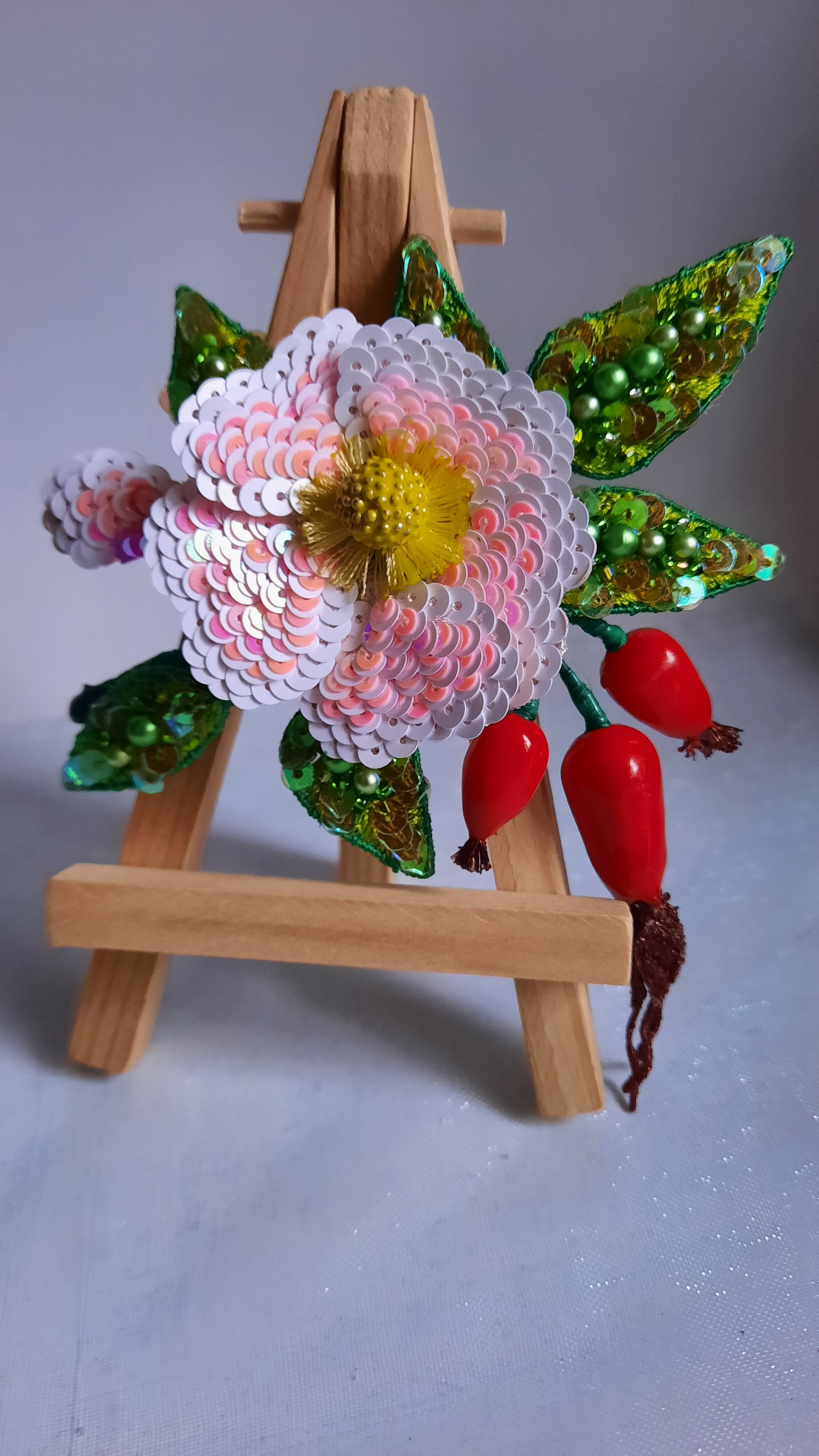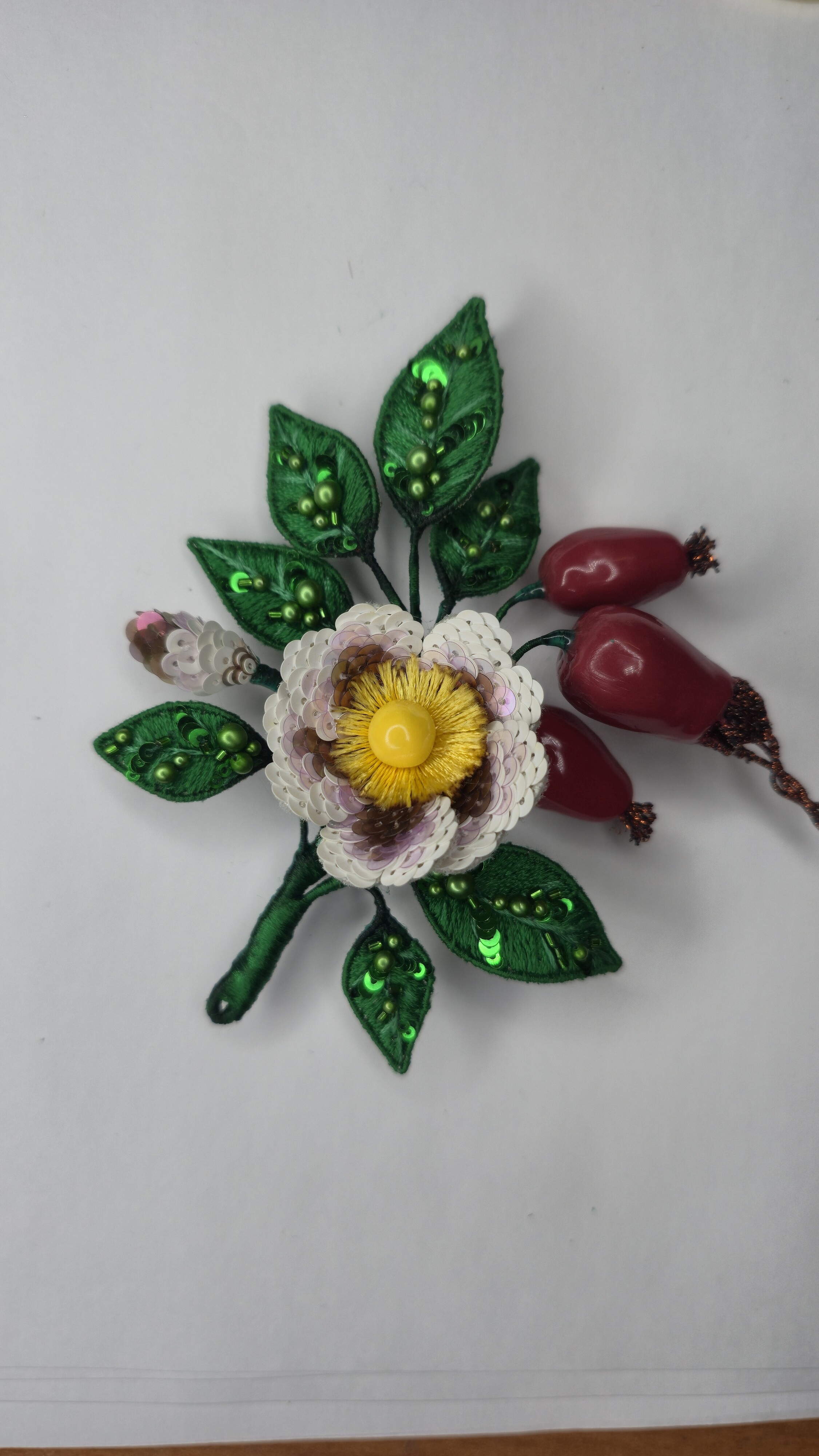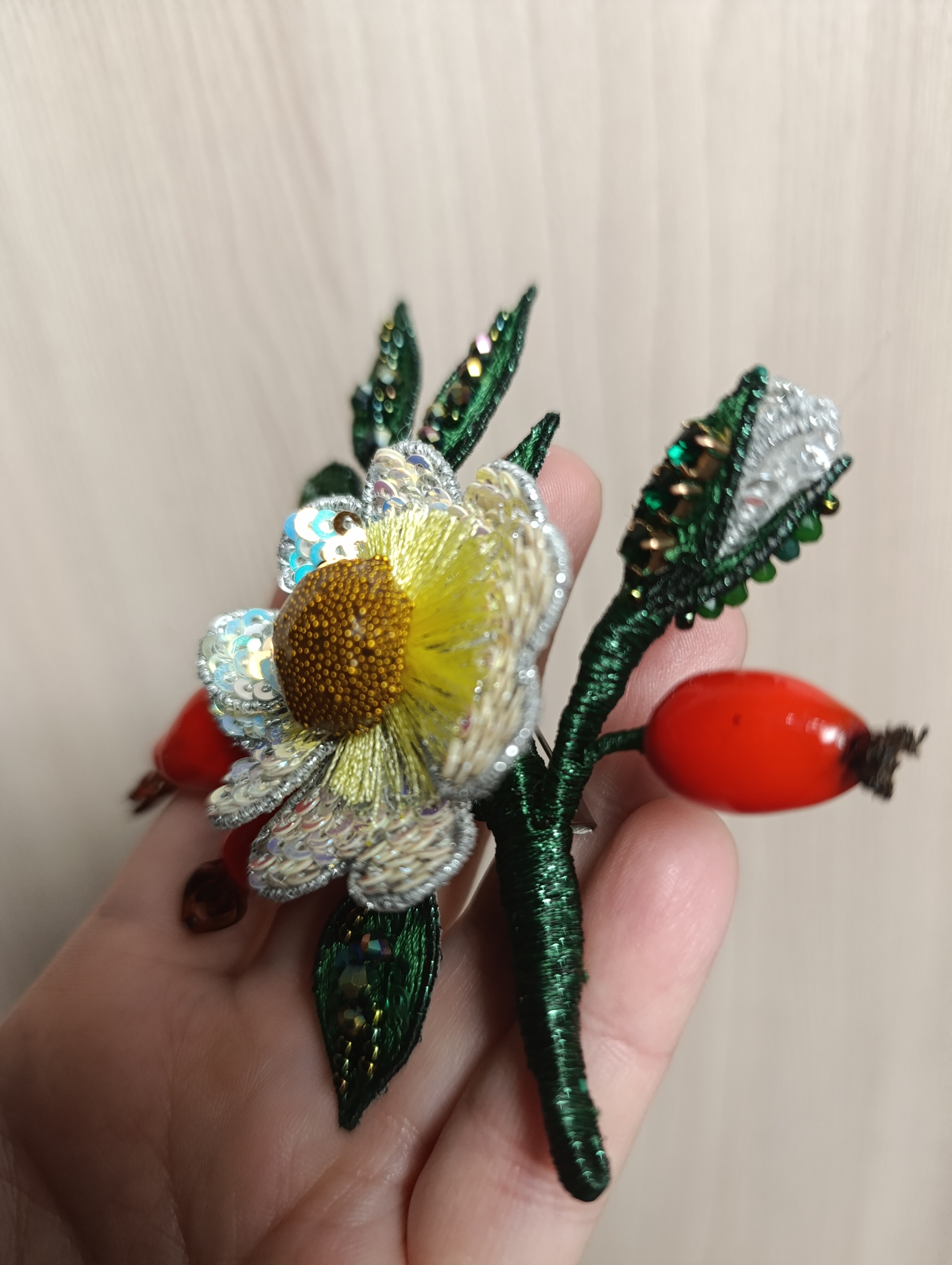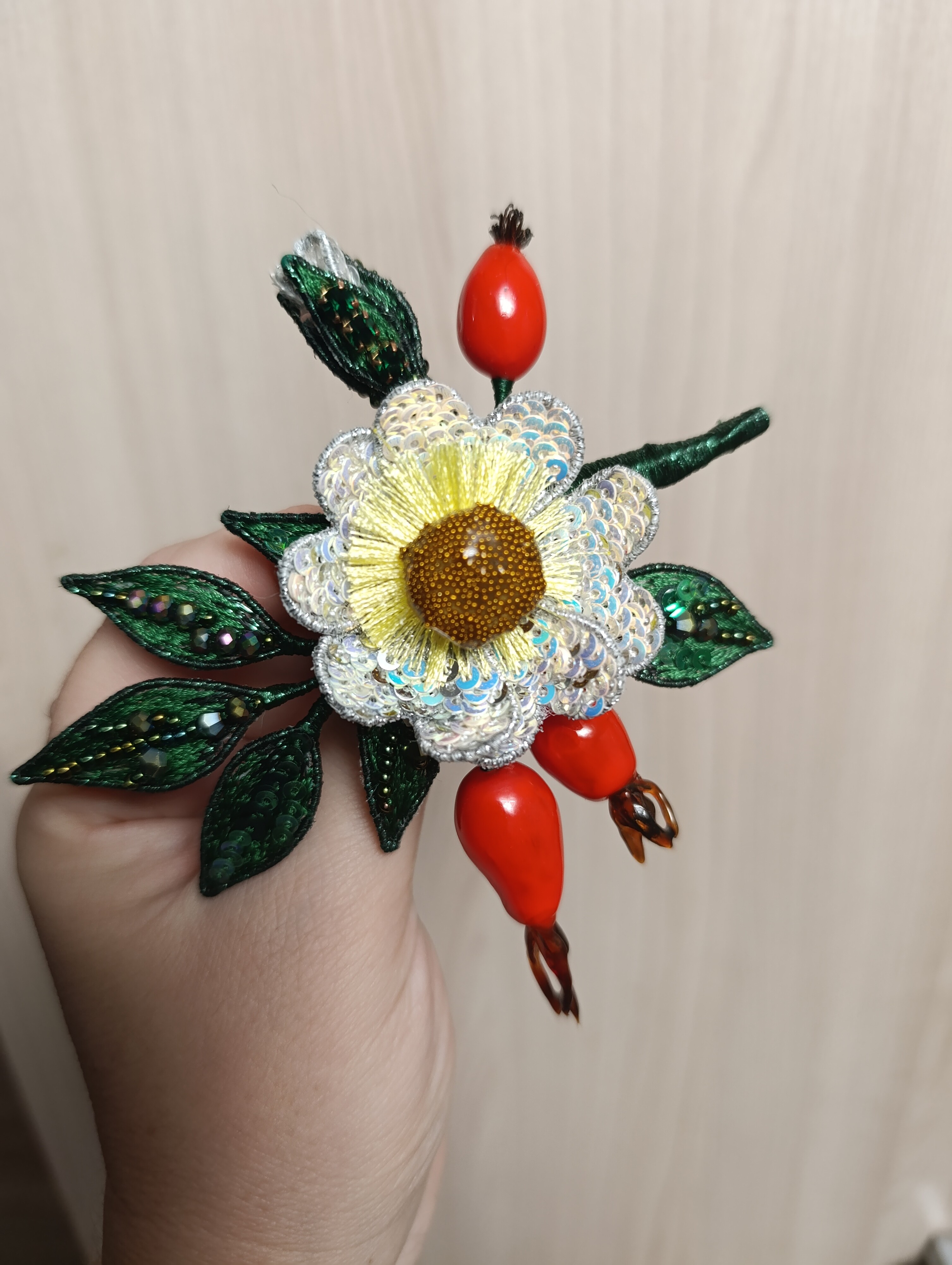 Ура! Брошь Дикий шиповник закончена! ❤ Очень гармоничная вышла веточка. Интересно было создавать ягоды, подбирать пайетки для красивого градиента цвета в цветке, смешивать краски, чтоб добиться нужного оттенка для ягод, замирать от восторга, когда получается желаемое, постепенно присоединять все детали к друг другу и радоваться преображению этого чуда! Благодарю за подробные и эстетичные уроки с приятным музыкальным сопровождением и за то, что полученные знания можно легко интегрировать в свои авторские задумки. Ваши уроки открывают безграничные творческие возможности �