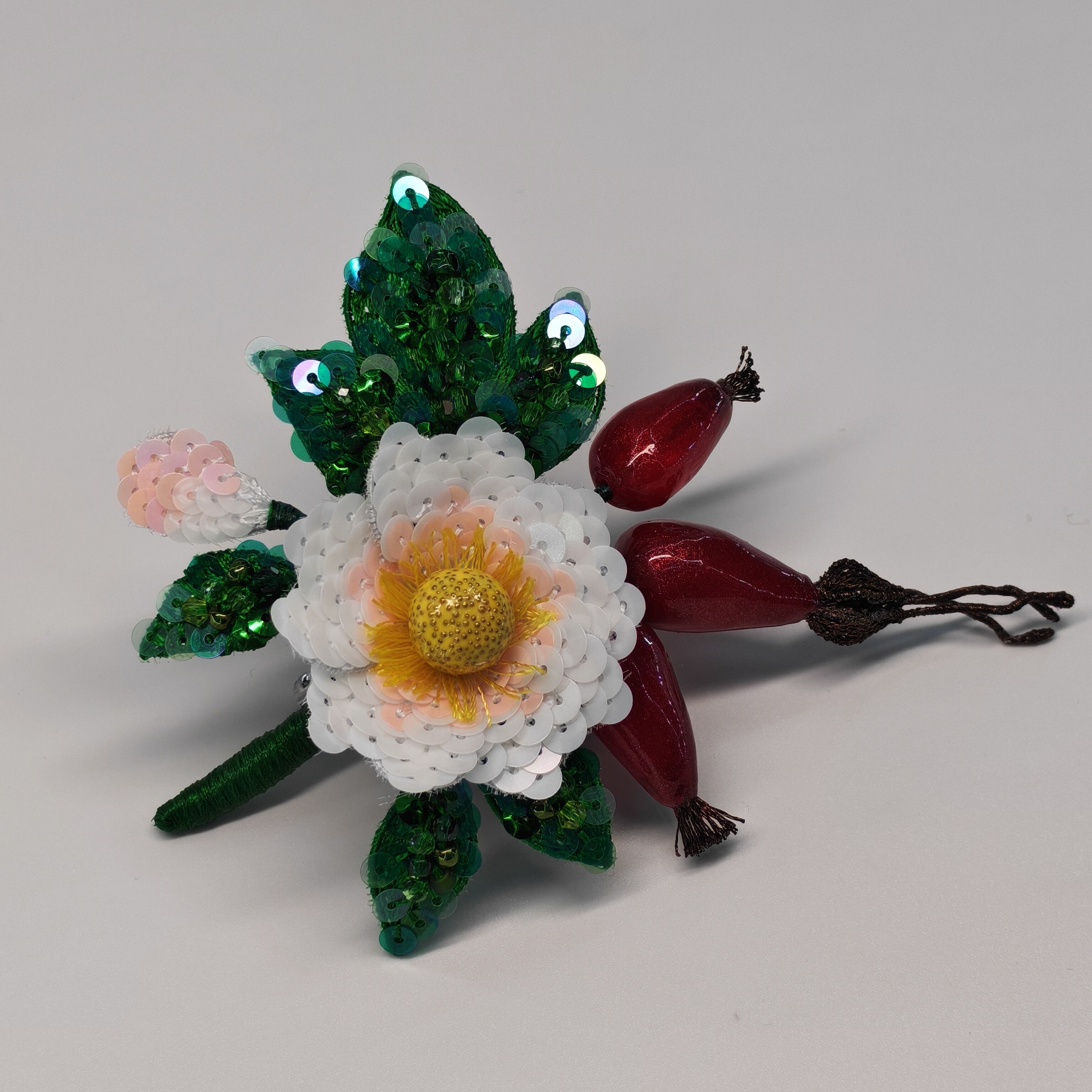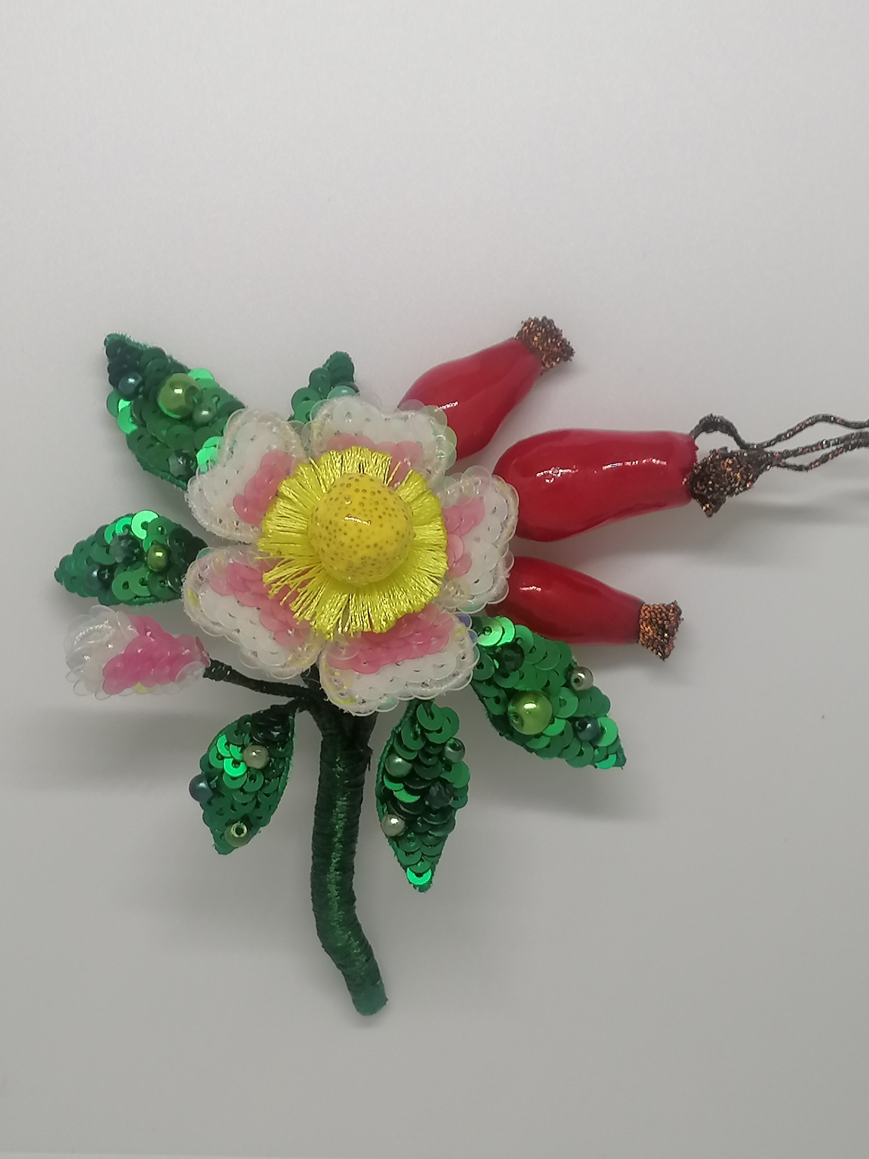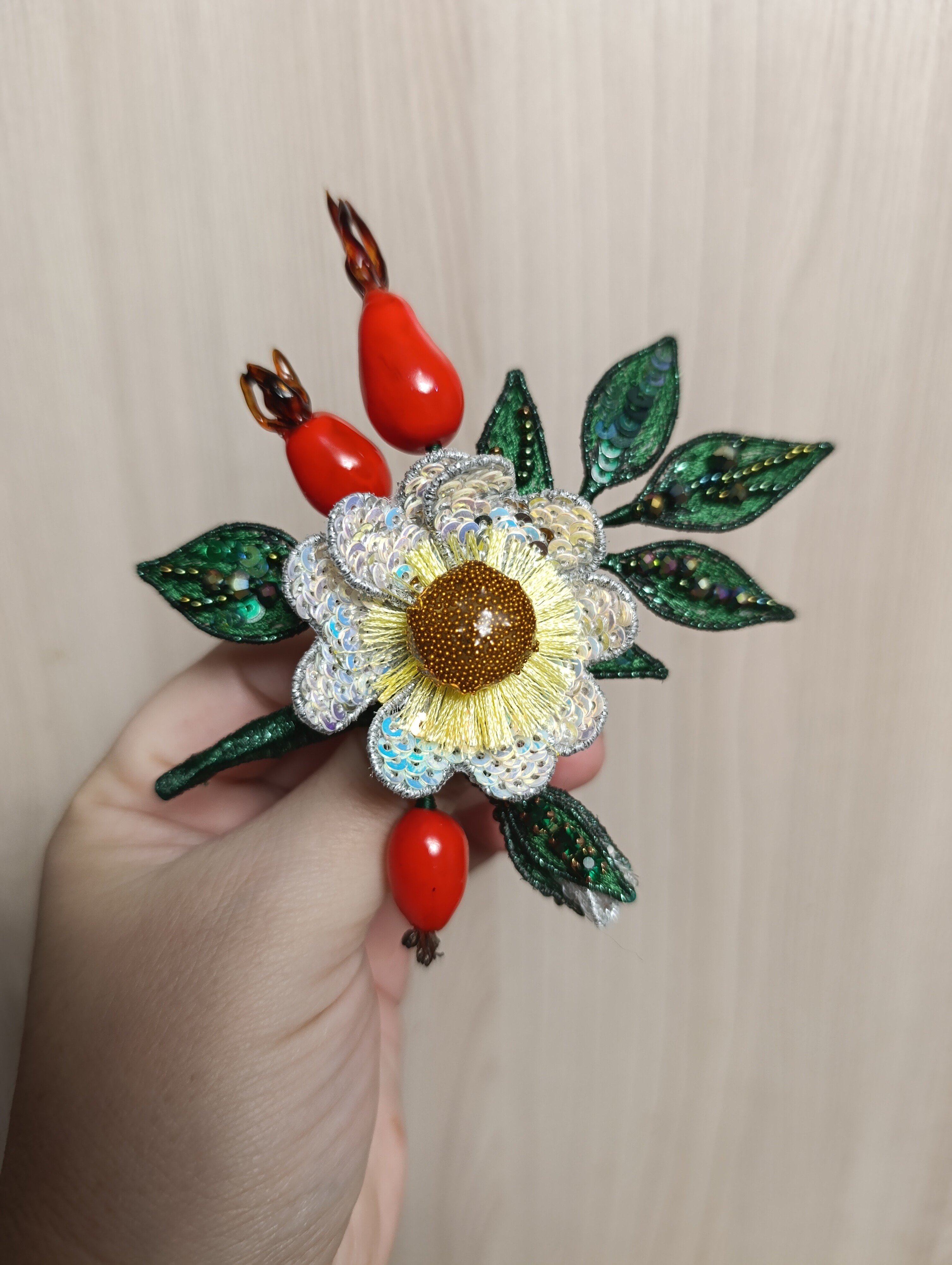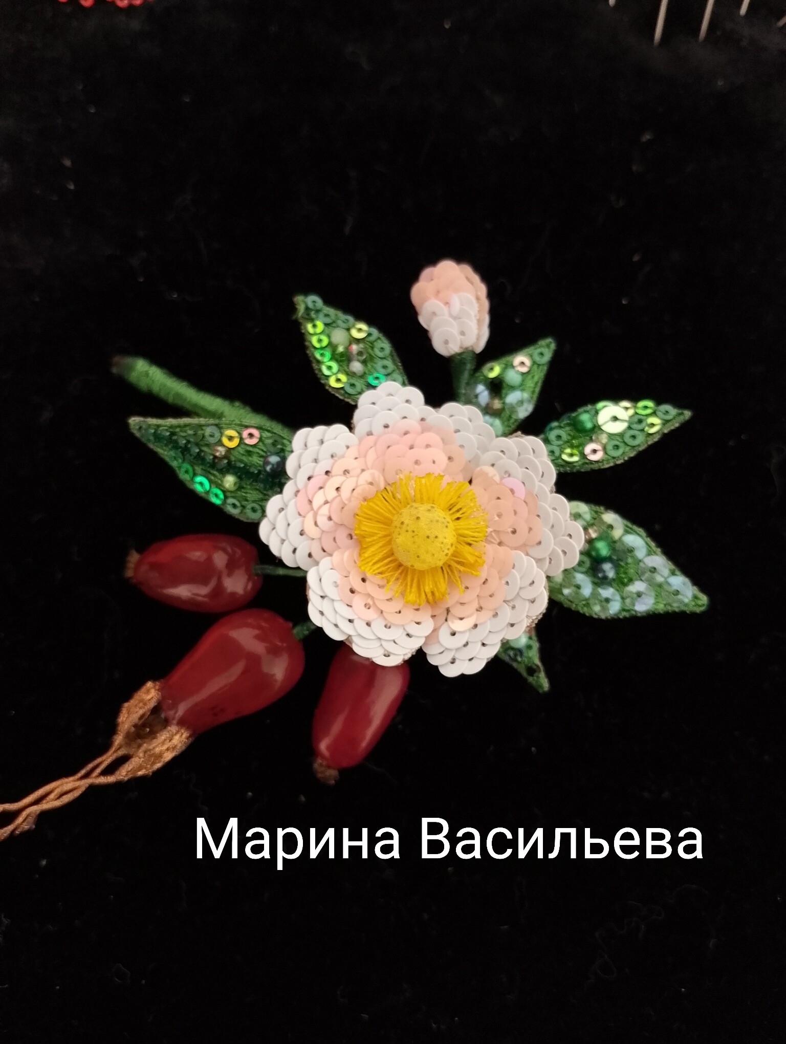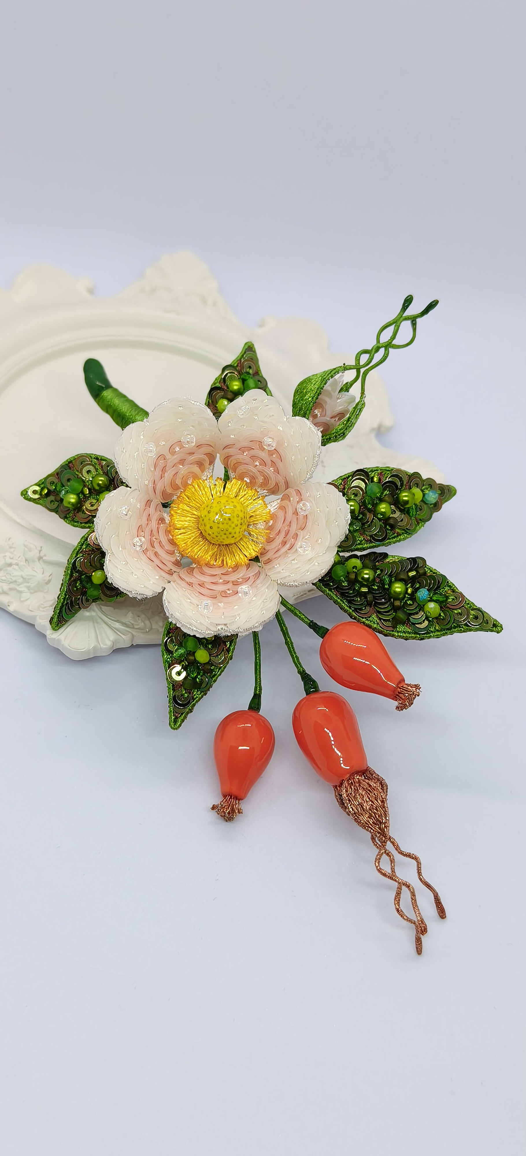 Ура! Брошь Дикий шиповник закончена! ❤ Очень гармоничная вышла веточка. Интересно было создавать ягоды, подбирать пайетки для красивого градиента цвета в цветке, смешивать краски, чтоб добиться нужного оттенка для ягод, замирать от восторга, когда получается желаемое, постепенно присоединять все детали к друг другу и радоваться преображению этого чуда! Благодарю за подробные и эстетичные уроки с приятным музыкальным сопровождением и за то, что полученные знания можно легко интегрировать в свои авторские задумки. Ваши уроки открывают безграничные творческие возможности �