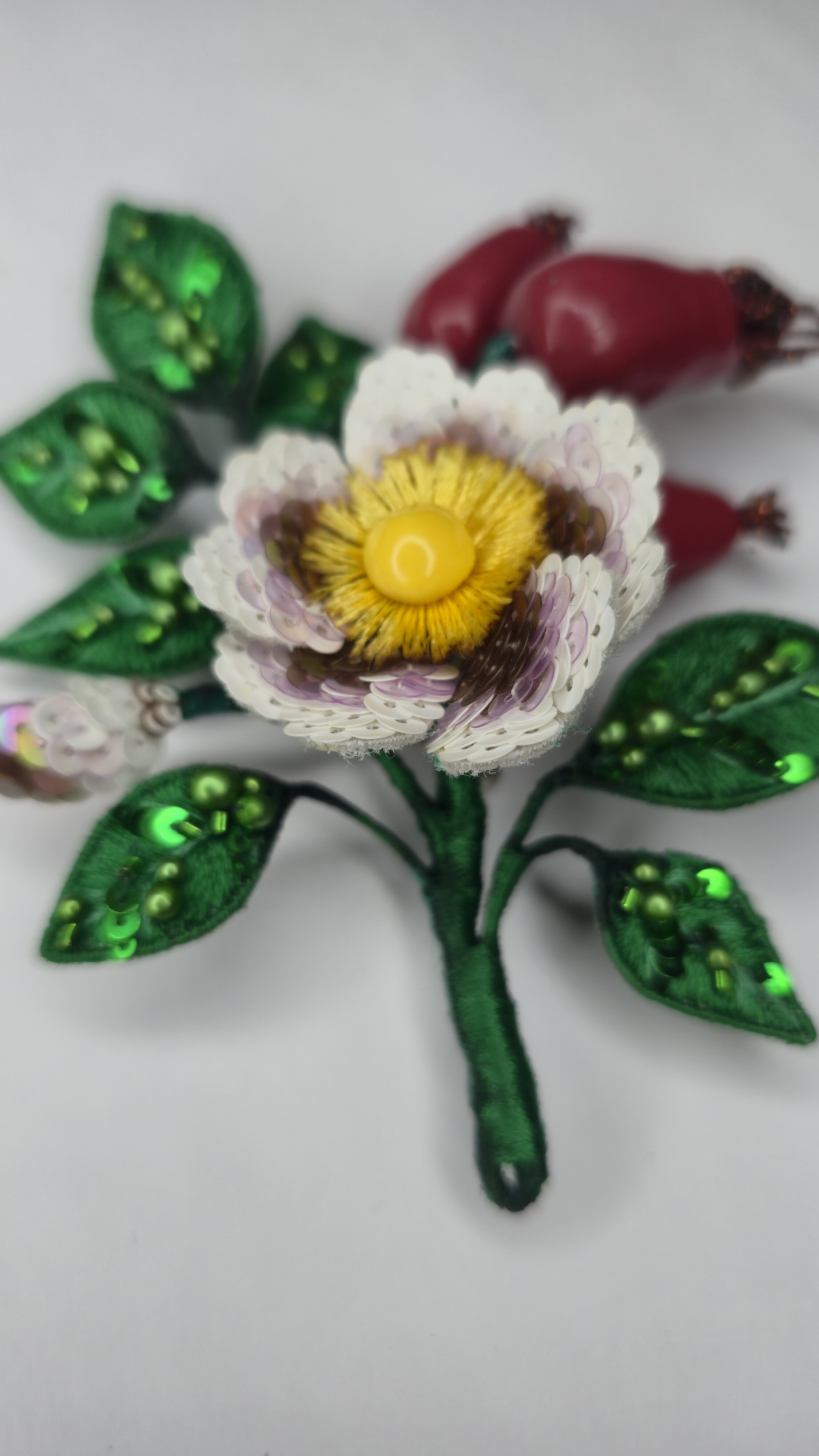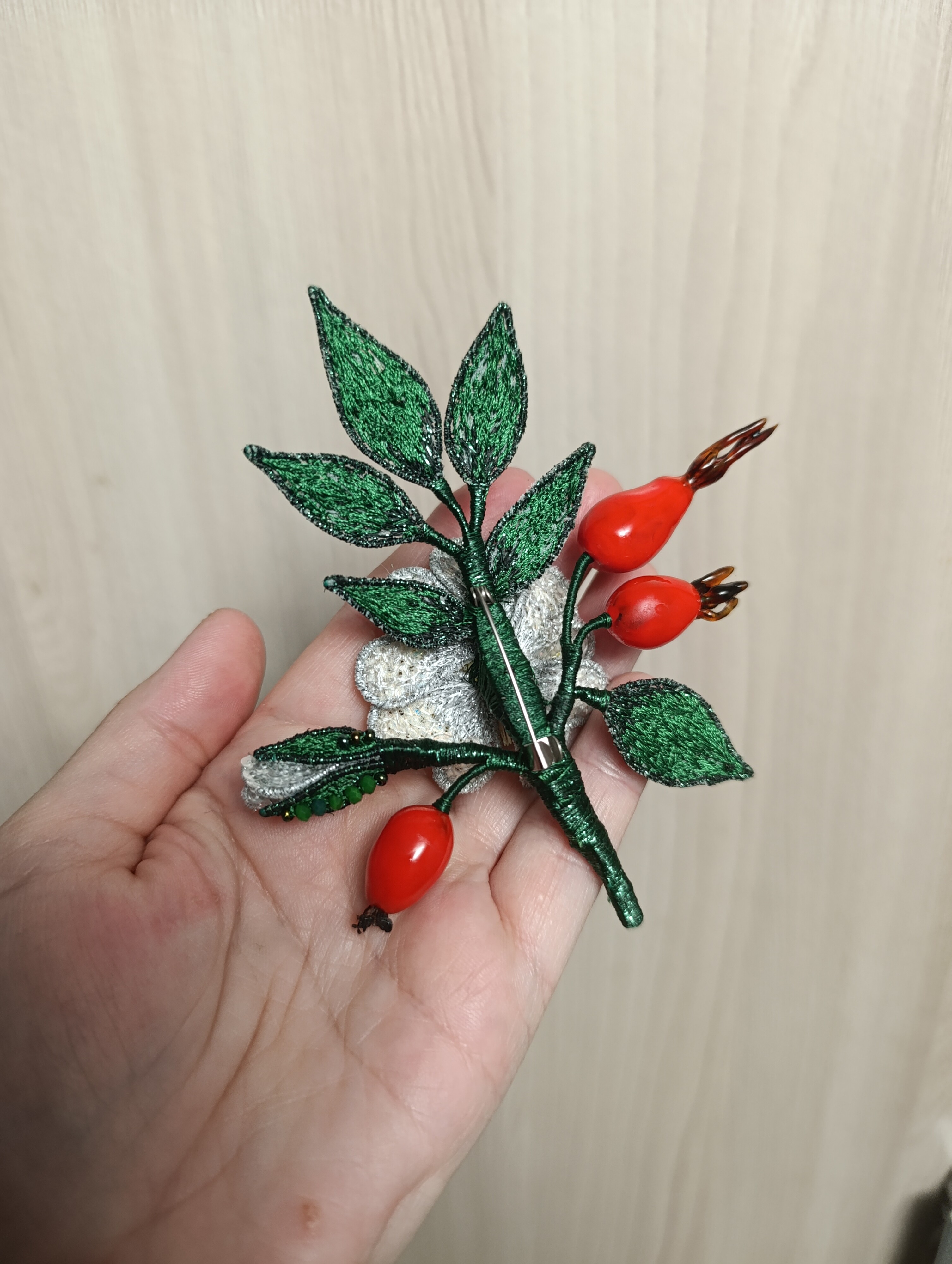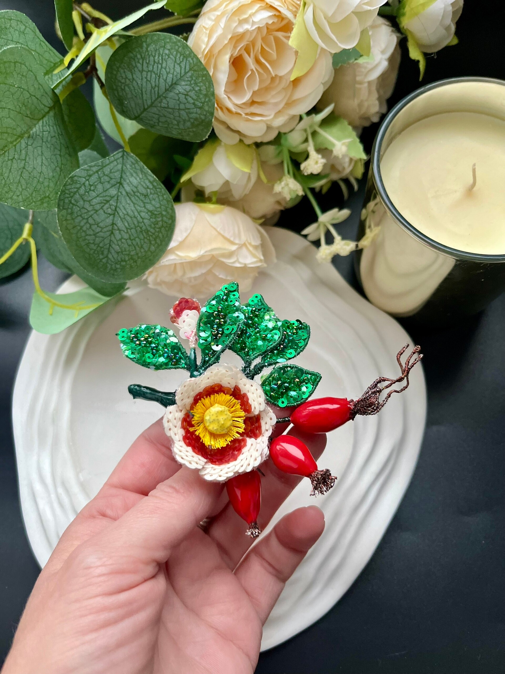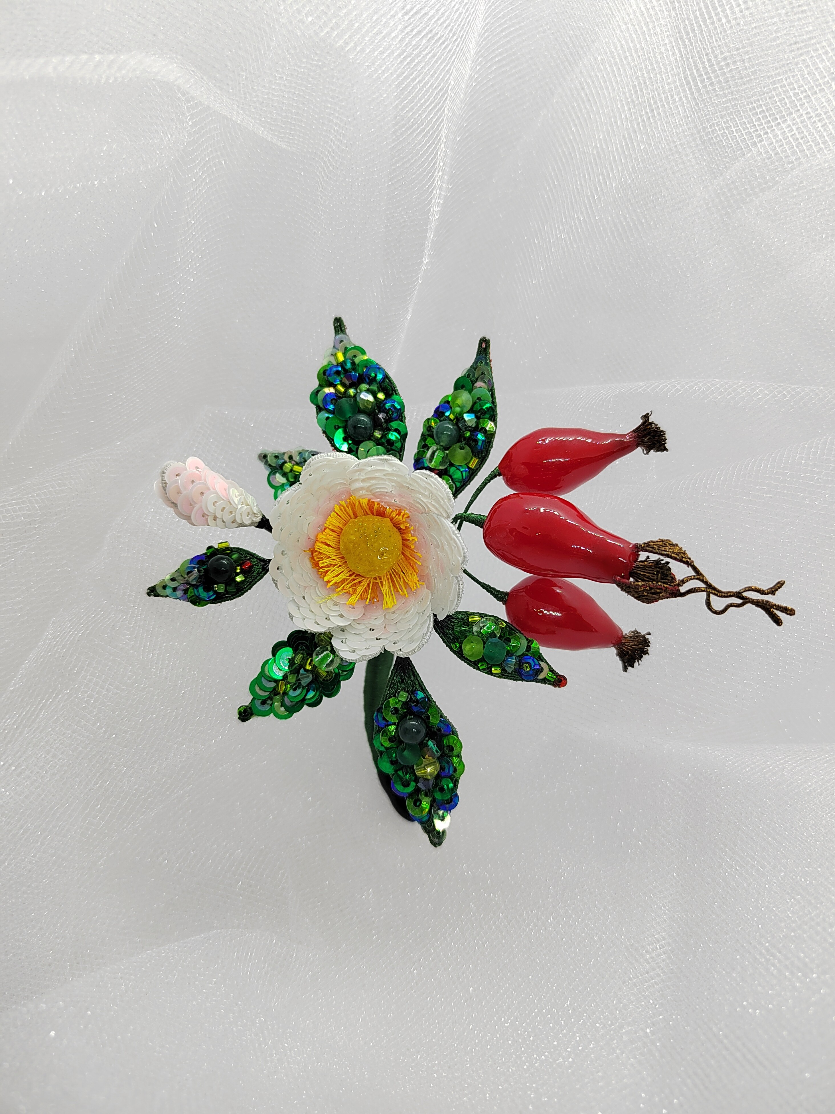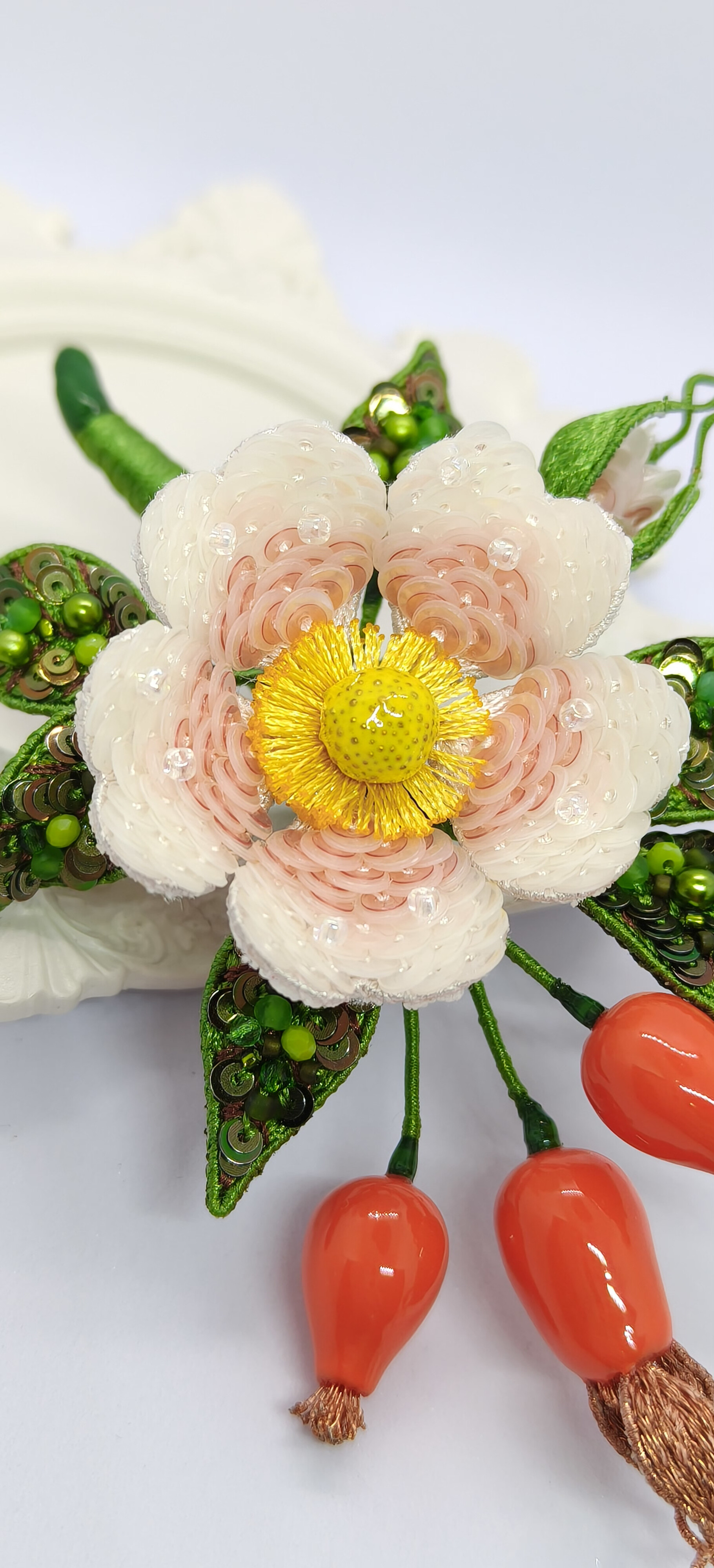 Ура! Брошь Дикий шиповник закончена! ❤ Очень гармоничная вышла веточка. Интересно было создавать ягоды, подбирать пайетки для красивого градиента цвета в цветке, смешивать краски, чтоб добиться нужного оттенка для ягод, замирать от восторга, когда получается желаемое, постепенно присоединять все детали к друг другу и радоваться преображению этого чуда! Благодарю за подробные и эстетичные уроки с приятным музыкальным сопровождением и за то, что полученные знания можно легко интегрировать в свои авторские задумки. Ваши уроки открывают безграничные творческие возможности �