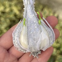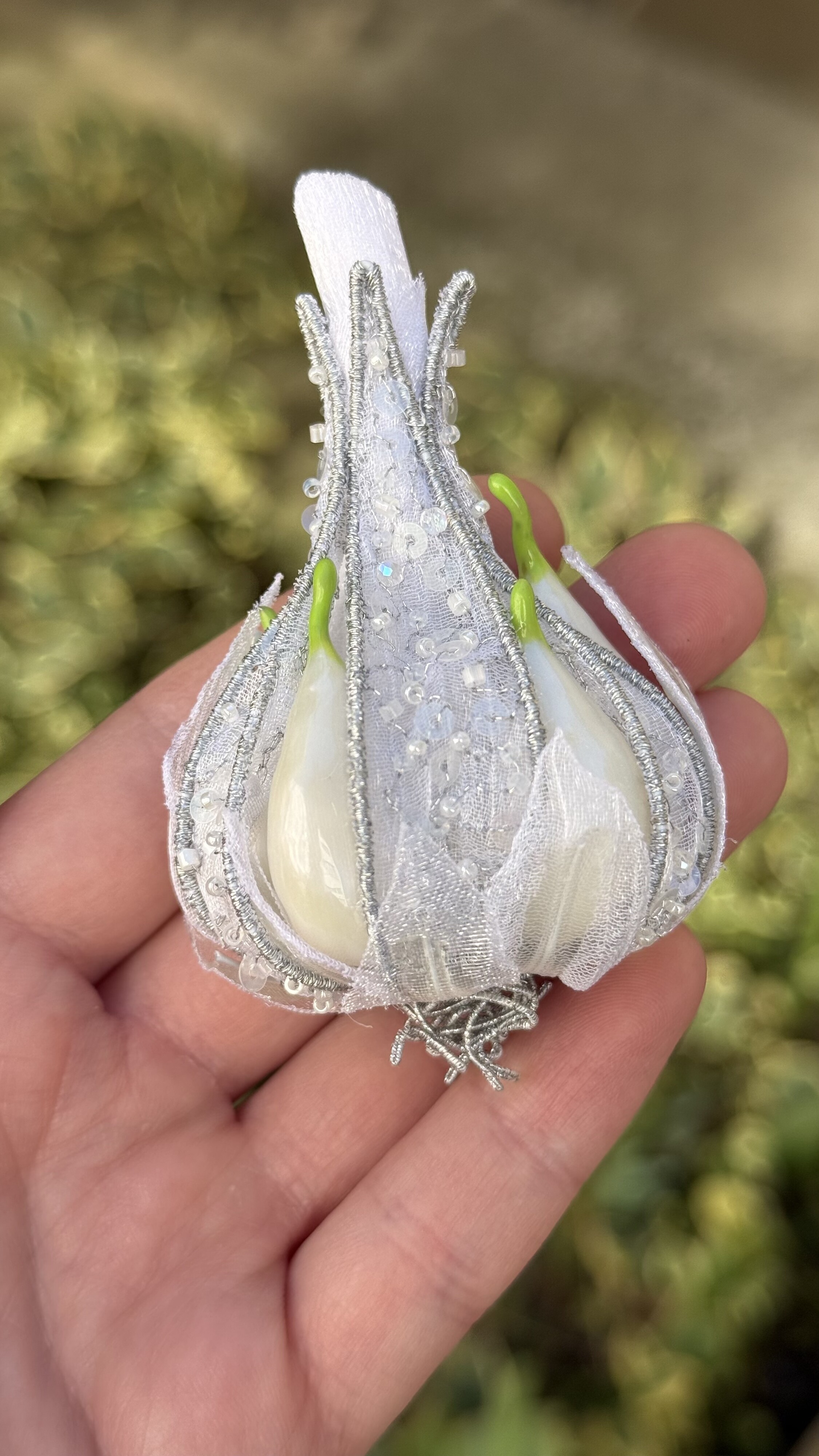 Результат превзошёл все ожидания — брошь получилась потрясающе реалистичной. Детали и фактура настолько живые, что создаётся впечатление, будто изделие действительно источает аромат чеснока. При этом вещь выглядит по‑настоящему роскошно: изящная форма, аккуратная работа с текстурой делают брошь эффектным аксессуаром.